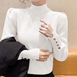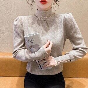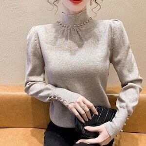 パールデザインタートルニット ハイネック オフィスカジュアル エレガント E657