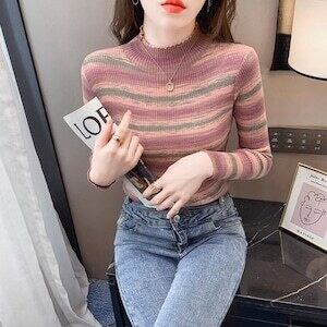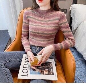 ボーダー風ニット ハイネックニット カジュアル エレガント E643