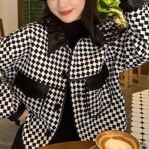 フェイクレザードッキングジャケット 千鳥格子柄 カジュアル きれいめ E583