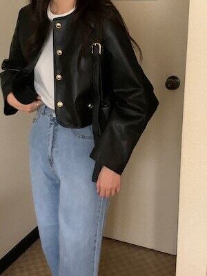 フェイクレザー風ジャケット ノーカラー ショート丈 エレガント E579