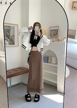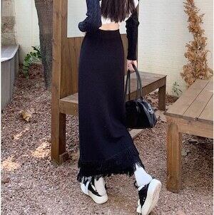 タイトロングスカート フリンジスカート ニット カジュアル E470