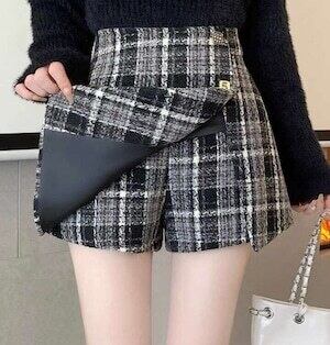 ハーフパンツ チェック柄 ツイード チャームボタン ガーリー ミニ丈 E730